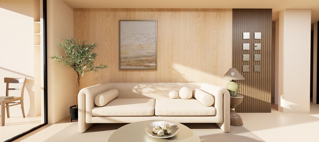 Sala con enchapado natural de eucalipto y piso spc