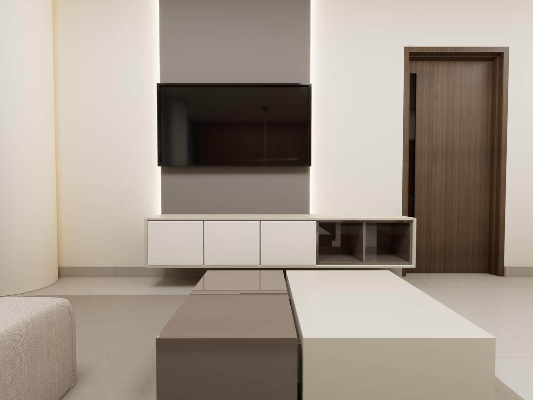 Sala de tv con tableros taupe moka verona marfil y sienna