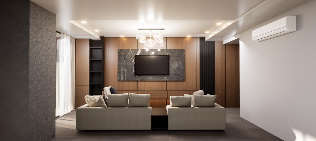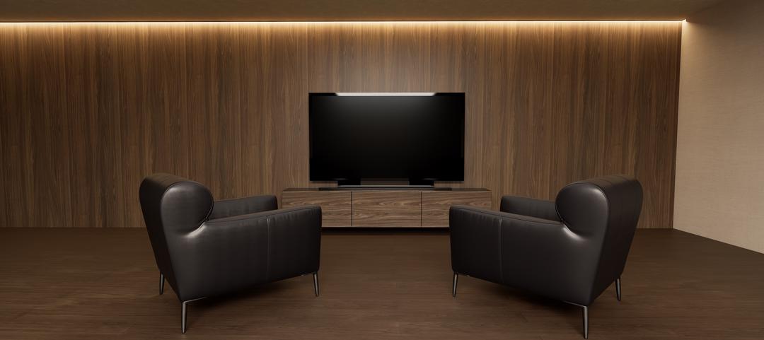 Sala de tv con enchapado de nogal natural