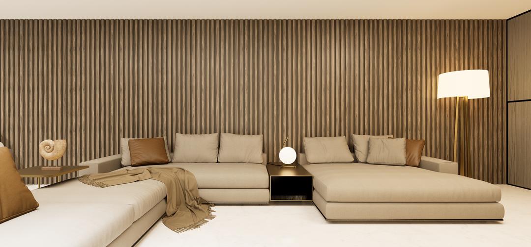 Sala con enchapado natural de encino con veta y lambrín nogal