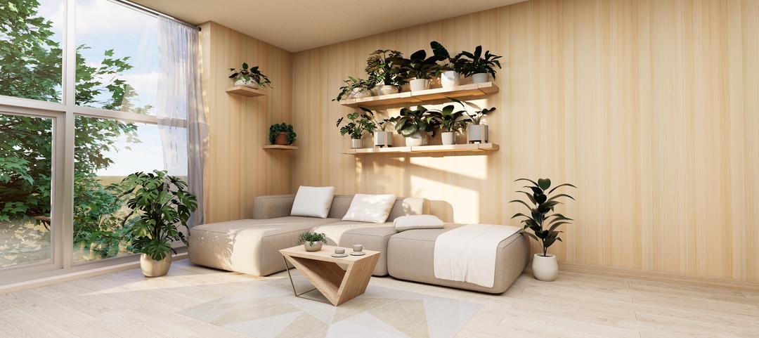 Sala con enchapado natural de eucalipto y piso spc