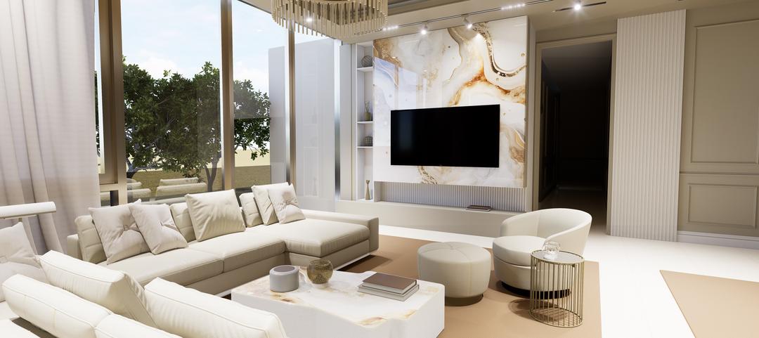 Sala de tv con tableros taupe moka verona marfil y sienna